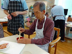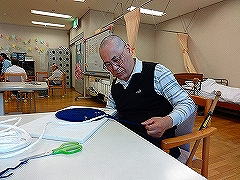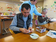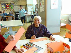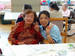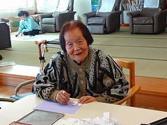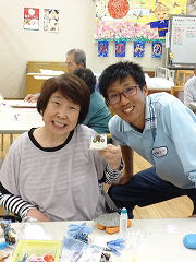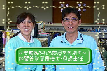 | 皆さんに「楽しかった~」と言って帰ってもらいたいんです。と話す鬼頭主任。 ゲーム、創作いろいろな場でワッハッハの声あふれる部屋になるよう皆さんと 交流し、楽しい雰囲気を作り上げたいんですと、見た目以上に熱意たっぷりの お人柄です。 目配り気配り 心配りのできるお兄さん的存在、頼りになります。 作業療法は週に1回。 革細工やコイリング、藤細工などの作品作りに欠かせないのが、 この加賀谷作業療法士です。欠かせないのが、ご利用者との作戦会議。 色遣いや、ちょっとした小技など工夫することで、楽しく仕上げることができます。 こちらも頼りになるお姉さんです。 |