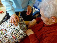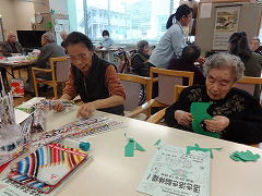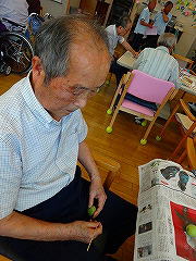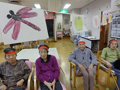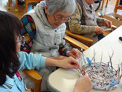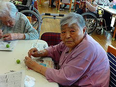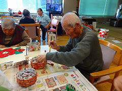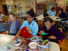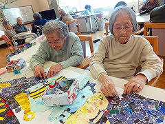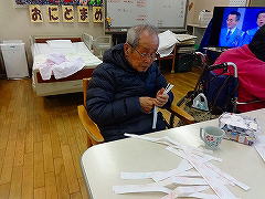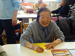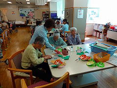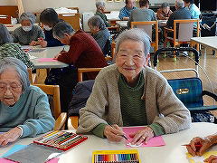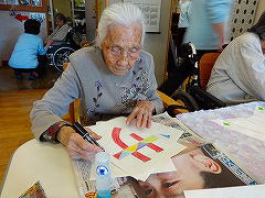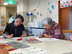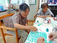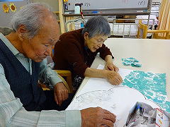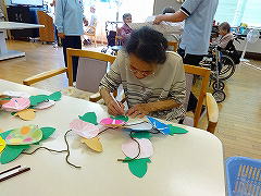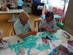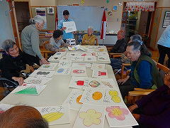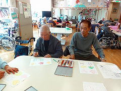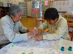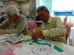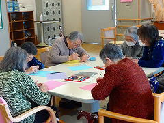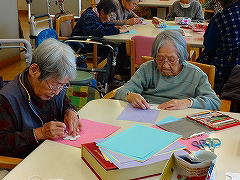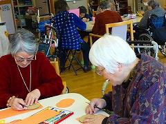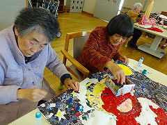 | ちぎり絵で壁紙を作成しました。紙を細かくちぎる、貼る作業は根気のいる作業ですが みなさん、談笑しながら楽しんでいました。立派な壁紙はデイサービスルームに 飾ってあります。 ![]() ![]() |