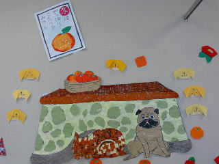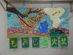 | みなさんと一緒に作成したちぎり絵です。 かわいいイラストにニッコリ、温かみのある色にウットリ、いつまでも見ていたくなる 作品です。みんなで一つのものを作り上げる作業は大変ですが、大きな満足感と 達成感でいっぱいです。お部屋に飾ってあります。う~ん、いい作品ですねぇ、、 |