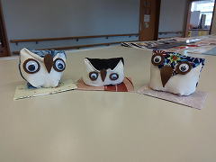| 創作活動で、フクロウの置物を作りました。 フクロウは「不苦労」(苦労知らず)、「福老」(幸せに年を取る)など 縁起物の置物です。とってもかわいい作者にそっくりな作品に仕上がりました ![]() |