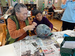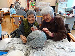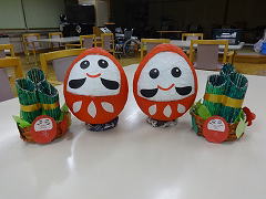 | まずは風船を膨らませて新聞紙をペタペタペタ・・・ はりこのダルマを作りました。 次に新聞をクルクルクル・・・門松を作り、お正月飾りの出来上がり! 可愛くできたので、良い年越しが出来そうです