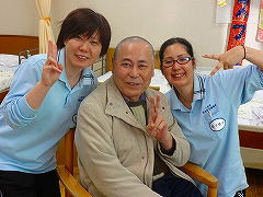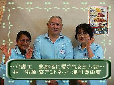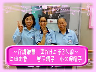 介護職員のベテラン3人です。 コミュニケーション、趣味、生きがいなど「その人らしさ」を大切にし デイサービスでは少しでも多く笑ってもらえるように 心掛けています。 創作活動が得意で、作業療法を担当しています。 お帰りの際、「あ~、今日も楽しかったなぁ」と言っていただけることが私たちの何よりの励みです。 あっはっはっは、、、わっはっはっは、、、笑い声あふれる3人でした・・・ |