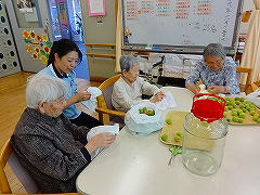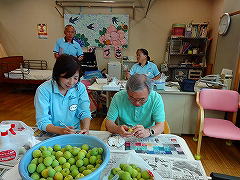 | 今年も恒例の梅ジュース作りをしました。梅のへたを取るのも慣れたものです。 この梅ジュースは今年も夏祭りで地域の皆さんと一緒に いただく予定です。 お楽しみに