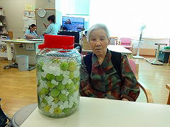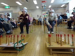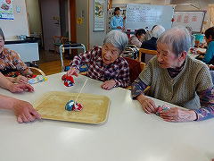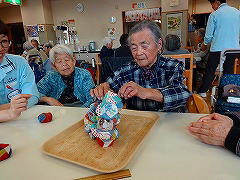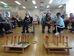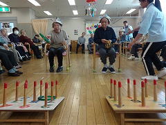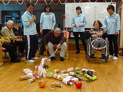| お手玉の山に立つ一本の棒、これを倒さずにお手玉を自分の所に持ってくるゲームです。 自分の番は慎重に真剣に、、、でも大笑いや応援の声が響き、楽しい時間でした。 |
