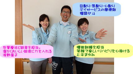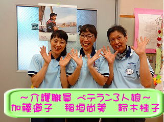 介護職員 声かけ上手の3人娘です。 勉強熱心で、運動の企画を得意とし、ダジャレが大好きな職員です。 笑っても泣いても同じ人生、同じ時間を過ごすなら楽しく元気に生きましょう♪デイサービスも楽しく来ていただけるよう、心掛けています。 話し始めるとダジャレが止まらない、元気はち切れんばかりの3人でした |