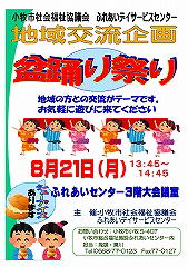 毎年恒例の盆踊りまつりです。 地域の方との交流がテーマですので、 みなさん お気軽に遊びに来てください。 日時: 8月21日(月) 13:45~14:45 場所: ふれあいセンター3階大会議室 ※直接お越しください。 |