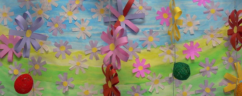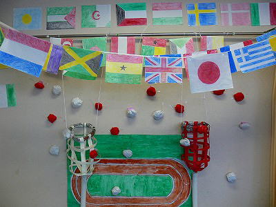 障がい者デイサービスのお部屋の壁です 旗に色を塗ったり、紙をきれいに丸めて球を作ったり、 みなさんのがんばっている姿が目に浮かびます。 ワイワイがやがや、作成しているときのにぎやかな声が聞こえてきそうですね。 そして、運動会の音楽も聞こえてきませんか? 青空も見えてくるのは、私だけかしら? |