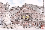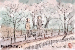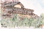 この料亭も「椿山荘」の一角を占めています。和風の建物は落ち着いた雰囲気をかもし、この中では多くの方が美しく並べられた日本料理に舌鼓を打っていることだろうと思いながら描きました。庭園の中は結婚式のお客さん以外に私のようなフリー?とおぼしき人たちが行き来し、まだ寒さの残る午後のひとときを楽しんでいました。 |