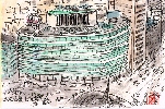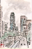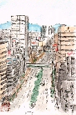 上と同じ時に描いたものの1枚です。ここはJRや阪神電車の大阪駅などが集中している所ですが、交差点の上にある歩道橋から南側を見るとこのようになっています。この絵を描いている間中、歩道橋の端の方から若者たちが演奏する賑わしい音楽が聞こえてきました。どうやら新興宗教のパーフォーマンスの様でしたが、何かに取り付かれたように頭上に手をかざしながら腰を振っていました。