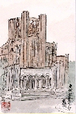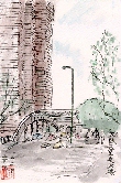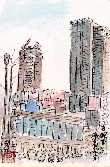 私の葉書絵の題材は仕事柄ほとんど愛知県と東京に集中していますが、今回大阪の関西電力に出張する機会ができたのでついでに数枚描いてきました。大阪へは2、3年ぶりだと思いますが、この絵を描いた中之島界隈ではビルの建設ラッシュで、まさか2008年のオリンピック誘致を目当てにしているのではないかと思われるほど、この不景気の中で結構活況を見せていました。この堂島大橋の左手のビルも完成まじかの高層マンションです。以前から感じていたことですが、大阪の高層ビルは東京と違って奇抜なデザインが多く、大阪人には秀吉の意表をつくような性格が受け継がれていて、人々にその賑々しさが残っているのではないでしょうか。 |