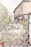 椿山荘は江戸時代の武家屋敷跡に建てられた施設で、当時はこの一帯に椿が多くあったためこのような名前がつけられたとのことです。結婚式場・ホテル・庭園などからなるかなり広いエリアで、庭園は無料開放されています。ここで3枚の絵を制作しましたが、この日は何組かの結婚式が執り行われていました。この絵の右手に少し描かれている建物が教会形式の結婚式場になっており、1枚描き終える間に2組の式が行われました。また本題の滝は立派なもので豊富な水が流れています。滝の裏側は通路になっていて、そこを通るときに聞こえてくる滝の音が印象的です。 |