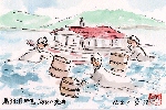 鳥羽といえば「御木本幸吉と真珠」で有名です。真珠島は鳥羽駅から数分の所にあり、かっては島に渡るのに船を使っていたのですが現在は橋で直接行けるようになっています。この光景は真珠採りのデモンストレーションで、3人の海女さんが海中に潜ってアコヤ貝を採っています。いったん潜ると2・3分は姿が見えません。水面に浮き上がると深呼吸をしますがその時に発せられる「フュー」という音が印象的です。この時の水温は確か9度だったと思いますが、職業とは言え厳しい環境にさらされる彼女たちは大変です。実演は約10分で終わりましたが見物した私たちも結構冷えてしまいました。 |
