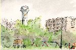 今年のゴールデンウイークは長い人で9連休、短くても5連休でした。この絵は私の地元の最も大きな「岩倉団地」の一角の、ゴールデンウイーク最後の土曜日の朝を描いたものです。ここでは遊園地で遊ぶ家族や子どもの姿は見当たりません。連休で外出中か連休疲れで朝寝坊しているためと思われます。彩色を施した貯水塔が新緑の中にひときわ目立っていました。 |