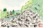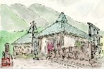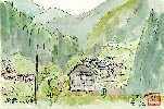 岐阜市の北部約20kmの山村風景です。この日は小雨がぱらついていたため、新緑が一段と美しく感じられました。絵の中央の建物は工事中ですが、洋風であるうえかなり大きいのでこの部落にはマッチしない、そんなことを感じながら描きました。この絵を描いた場所も「道の駅」の一つです。