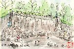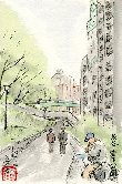渋谷駅の北側に山手線に沿って位置する細長い公園です。この絵を描いたのは午前中で人通りも少なく、ホームレスと思われる男性数人がたむろしていました。ホームレスはどこでも見かけますが、最近はかなりリッチな身なりの人も居るようです。次第に暖かくなって彼らの住環境も向上することでしょう。 |
