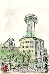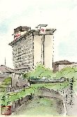 名古屋での仕事のついでに、名古屋市内で目にしたいろいろな光景を描きました。このホテルは名古屋の代表的なホテルの一つで今でも由緒ある家柄の結婚式や、著名な人たちが出席するパーティーなどに利用されています。私の二男が勤務している民放が制作した「名古屋嫁入り物語」の結婚披露宴風景の一こまとしても時々利用されたようです。上の方の階の部屋から東(この絵の右側)を見ると名古屋城が一望出来ます。 |