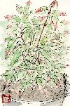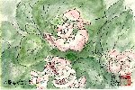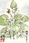 自宅の庭の一角にはドクダミが自生し、取っても取っても増えて困っています。むしると手に独特のにおいが付着します。しかし可憐な花は憎めません。早速絵にしてみました。葉の緑と薄いピンクの取り合わせが良いです。最近妻が「絵てがみ」を習いはじめ、ドクダミを題材にして描きました。太い墨の線に囲まれたモチーフがドクダミの表情を力強く表わし、私の絵の「可憐さ」とは大分違っています。 |