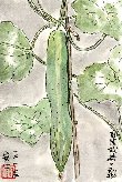 妻が苗一株を100円で買い、庭に植えておいたキウリが意外に大きな実を付けました。長さ約25cm、太さ3〜4cmのずんぐりですが初物であるため早速描きました。塩もみにして食べたところ意外に甘みがあっておいしかったです。結局この茎には5個程度しか実らなかったのですが、払った金のモトは引けたようです。キウリと同時に100円で買ったミニトマトは、茎だけが立派に延びたものの実が3個程しか付かず、こちらは「採算割れ」です。しかも妻が一人占めし私には回って来ませんでした。妻がミニトマトにも肥料を十分に与えたのですが、全部茎に回ってしまったようです。ここでは株が少ないく、ミニトマトは花が小さいので蜜蜂などによる受精が不十分だったも知れません。 |