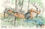 上の絵と同じ日に名古屋セントラルパークで描いたものです。まだ6月になったばかりなのに、このように上半身裸で気持ちよさそうに寝そべっていました。周囲にはこのように青や黄色のビニールシートのほか、雑誌・古新聞・得体の知れない袋物が所狭しと並んでいました。 |