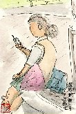 携帯電話の普及には目を見張ります。特に女子高生を中心とする若い男女は、乗り物の中では電話器とにらめっこして忙しそうに指を動かし、歩いていても電話器を耳に当てて何かつぶやいている。もう携帯電話は彼らの体の一部になりきっています。この女子高生も私がスケッチしていることに気がついてもぜんぜん気にせず、何度も電話器を操作していました。私も携帯電話を持っていますがもっぱら「携帯」専用です。 |