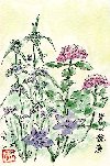 自宅の庭に咲き競っている花々を一個所にまとめて描きました。左から「ムラサキツユクサ」・「アジサイ」下に「キキョウ」です。同じ紫でも青系から赤系、花の形状によって別な色合いを見せるなど、自然が作り出したさまざまな色彩の特徴は真似ることが出来ません。9月に入った現在これらの花はすべて無くなっていますが、また明年6月頃には同じ姿を見せてくれる筈です。 |