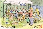 岐阜県板取村は24kmにもわたる「あじさい街道」で有名です。また「あじさい街道」の途中に温泉浴場があり、浴場建物の前面のあちこちにも非常に珍しいあじさいが数多く植えられています。この絵はあじさいの大株のそばで昼食を取利ながら談笑している老夫婦を描いたもので、ご婦人が紫色の帽子をかぶっていました。私たち夫婦はせっかく温泉浴場に来たので早速入浴しましたが、偶然にも女性風呂は大阪方面からのバスツアー客でごった返し、妻はとても風呂を楽しむどころではないとぼやいて出てきました。 |