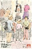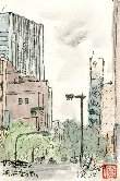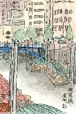 このあたりは中央区の下町、問屋街の中心部です。道路を挟んで大小の店が並び、婦人服、カバン、靴下、織物などあらゆる物がうず高く積まれています。買っている人はまばらですが、主に問屋であるため店の奥では商談が進んでいるかも知れません。この絵の中央の女性は今はやりの「茶髪・ガングロ・ヘソ出し・厚底」です。それでも東京ではこの手のファッションは少し下火になったようです。 |