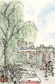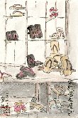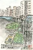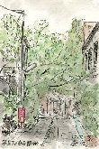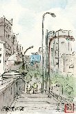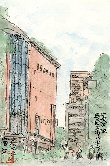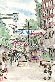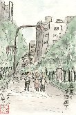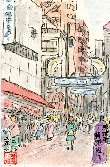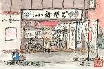 浜町や東日本橋界隈ではこのような小じんまりとした商店を多く見かけます。この下駄屋さんもかなり古そうで店の歴史などに興味を覚えましたが、買わないのに店に入るのも気がひけたのでこっそり絵だけ描かせてもらいました。「若松屋」という名前もなかなかフィットしていると思います。後日店内をのぞいて創業大正13年という張り紙を目にし、あの世界大戦の戦禍を経て80年近くこのように小さいながら風格が保たれていることに感銘を覚えました。並べてある下駄は格調高い婦人用、今では余り使われないと思われる男性用、可愛くてはなやかな子供用など色とりどりで、見ていても飽ききません。 |