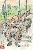 梅雨が明けて非常に蒸し暑い日々が続いています。この界隈の公園や木陰にはこのように暑さを避けて夢を貪る男を見かけます。ここは浜町公園の一角で昼休みにも関わらず暑さのせいかあたりを行き交う人もまばら、横たわっている当人も安心して眠れるかも。それにしても身につけている衣服は割合まともでした。 |