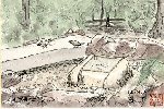 人形町というより浜町を横切るかたちで南北約500mにわたって、幅約20mのグリーンベルトがしかれています。その中間に溝が造られ絶えず水が流れていますが、その出発点はこの絵にある湧水口です。時々小鳥がきて水を飲んでいます。グリーンベルトはかなり大きな木々で覆われており、水の流れとあいまって夏の暑さから私たちを救ってくれているようです。 |