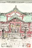 水天宮は私の事務所から約20分のところにあり、 安産と水難の神様として名高い神社です。長男の嫁さんが妊娠したとき妻とともにお参りもしました。また境内にある弁財天は日本橋七福神の一つになっています。この絵は朝の出勤途中少し余裕があったので回り道して描きました。午前9時前というのに蒸し暑さが応えました。正面では2・3人の巫女さんが静かにお祈りをしていました。私たちが普段見る巫女さんはお札所に座っていることが多いですが、このように仕事始め?の前にお祈りをするという習慣がある事を初めて知りました。 |