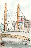 隅田川にかかる橋としてはモダンな形をしており、橋は吊り橋のようで支柱は鮮やかな黄色です。この絵の手前側は日本橋浜町、向こう側は江東区新大橋です。私の事務所から橋までの距離は約1kmで途中に浜町公園等があるほか、この橋のたもとには隅田川に沿った歩道があるため昼の散歩には最適です。ただこの付近は車の騒音がかなり大きいため、昼休みを楽しむ人の姿はまばらでした。 |