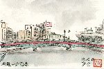両国橋は隅田川に掛かっていて西側は中央区日本橋、東側は墨田区両国です。この絵は東日本橋に移って初めての作品で、橋を下流から見たものです。当日は薄曇りでしたが、朱色の橋桁が鮮明でした。橋の上は車がひっきり無しに通過し、、数多い隅田川の橋のうちでも車が多い方ではないかと思います。橋の更に上流にはアサヒビール本社の特徴あるシンボルがあり橋上から良く見えます。また両国橋を渡って北東数100mのところに両国国技館と江戸東京博物館があります。 |
