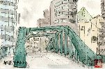 神田川に掛かる橋のうち最も隅田川の近くにあります。橋の名前も神田川のこの付近に植えられている柳にちなんで付けられたのではないかと思います。この絵は北側から描きましたが、鉄骨が太くどっしりして男性的な形をしています。通過する車の数はあまり多くなく、神田川の屋形船を眺めるにはぴったりです。後日この橋を通った時数人のご婦人がスケッチをしていました。 |