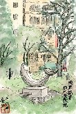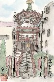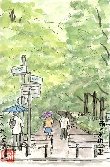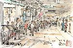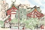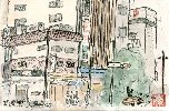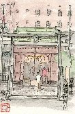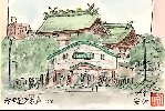 今年の8月下旬は大変暑く、屋外でのスケッチは街路樹の下で汗をこらえてやっています。この水天宮は南側の水天宮通りで描いたものです。うっそうと茂った木々の間から緑色の屋根と建物の朱色の柱がくっきりと現れています。この絵では見えませんが道路沿いにはお菓子などの土産物店が軒を並べています。また後日判ったことですが、水天宮の境内地下は貸し駐車場になっています。