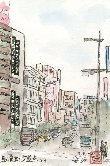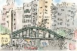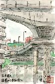 日本橋川は神田川と平行し隅田川の下流側に流れ込んでいます。しかし殆ど川を塞ぐように高速道路が走っており、地図では見にくいです。この絵は日本橋川に掛かる鎧橋(よろいばし)から下流側の茅場橋を見たものですが、上部の高速道路ばかりが目立って茅場橋は申し訳の感じです。しかしこうして絵にしてみると、高速道路のいかめしいコンクリート建造物の間に、橋や川の水面を垣間見るという面白い光景ではあります。