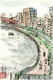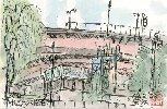 隅田川水上バスは浅草を起点にし、東京港内を巡回運航しています。浜町発着所は両国橋下流の浜町公園近くに置かれていますが、ここで乗り降りする客は殆ど無いためか水上バスの発着回数も少ないようです。場所的にも高速道路の下にあって一般的な桟橋の風情はありません。この絵も雑然とした雰囲気だけを表した感じです。