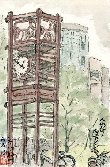 甘酒横丁交差点を挟んで人形町通りの歩道に建っています。高さは約5mで上部の四角部分には「人形町」の彫刻文字があり、その下に背中合わせに時計が備えつけられています。大部分は街路樹に隠れてしまっているため、歩行者で気のつく人は殆ど居ないのではないかと思いつつ描きました。