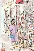 日本橋界隈には多くの大小の老舗があり、この店もあちこちで見かけます。そして販売している品物が店によって衣類や学用品など多種にわたっています。この絵は雑貨屋さんで、店頭ではご婦人が小箱を持ちながら何かを探している様子を描いたものです。