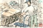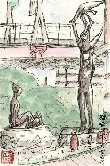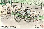 両国橋のたもとで昼寝をむさぼる男を描きました。9月の残暑の中、この日は曇っていたのと隅田川から吹いてくる風のおかげで木陰でなくても眠れるのでしょう。自転車の篭には何かしらビニール袋に入った荷物がどっさり入っています。
