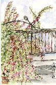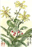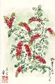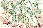 この花も最近になって見かけるようになりました。花の形や大きさが「コエビ」に似ているのでこのように命名されており、英名でも「Shrimp.Plant」というそうです。この植物の花は先端の白い(この絵では黄色に描いてある)部分で、赤い部分はこれを包んだ葉の一種のようです。皆同じような形をしているものの、右や左に曲ったり上や下を向いたりでしばらく見ているとなかなか妙味を感じます。図鑑では夏の花と出ていますがほとんど年中咲いているようで、今後鉢植として人気が出るものと思われます。珍しい花なので私も是非手にいれたいと思っているものの一つです。この花の持ち主の野本さんは私の職場の近くにある染め物・洗い張り屋さんで玄関先に植えてあり、通勤途上毎日勝手に鑑賞させて貰っている訳です。 |