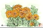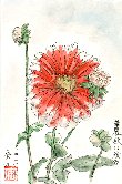秋の花の代表格は何といっても菊です。私は今までかなり多くの花を描きましたが、本格的な菊を描いたのは初めてではないかと思います。というのは菊自体どこでもあり何時でも描けるという気持ちと、一部の鉢植大輪などを除けば花びらが多いだけで特徴に欠けるという先入観によるものと思います。しかし描いてみるとなかなか味のある作品になります。最近絵手紙を始めた私の妻が私の葉書絵が絵手紙にくらべてはるかに細かいタッチであることに感心し驚いています。描いてみて新たな刺激を受けましたので、今後も新しい感覚でトライすることにします。 |