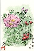 上の絵を描いた翌日の作品です。やはり隅田川畔の「ピラカンサ」より下流側で見かけました。最初見たとき花・実・茎の刺の状態などからバラの一種だろうと感じましたが、「ハマナス」らしいと知のは自宅の図鑑でです。ただ「ハマナス」は北海道・東北地方などの寒冷地の植物とのこと、隅田川下流の暖かい地域でも咲くのかどうか多少疑っています。そういえば数年前妻と北海道旅行して知床かどこかで見かけた記憶があります。北海道の花や図鑑に載っているものは花びらが一重ですが、ここの花は八重ですから改良品種だと思います。丁度熟した実が多くついていましたので、自宅に植えてみようと数個持ち帰りました。 |
