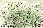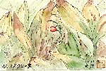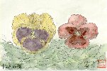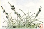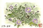 自宅の庭に遠慮気味に咲いた野菊。種子がどこからか飛んで根づいたものです。描いていると花に蜜蜂が止まりました。飛び去る前に絵に加え、花の淡い紫と蜂の茶色の取り合わせを少しでも出そうとしましたがあまり目立たないようです。昨年秋テレビで野菊など1万株以上の野草を育てている方の紹介番組を見ましたが、野草は人工的に改良などを繰り返したものとは違って独特の味わいが感じられ、その魅力に取り付かれる気持ちも解るような気がします。 |