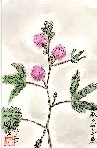 東京中央区の職場近くにある小学校で見かけたものです。そばにいた先生に花の名前をたずねたところ「オジギソウ」とのこと。家に帰って図鑑で調べましたがこの名前では載っておらず、結局正しい名前は解らずじまいです。直径1.5cm程のビロードの玉に例えられる、綿状で淡いピンク色の花が何とも言えない可憐さを表しています。小学校や幼稚園の花壇にはふさわしい花です。茎の高さは1m程度で葉は「ねむ」に似ております。 |