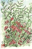 東京中央区立スポーツセンターの庭に植えられています。花ではありませんが朱色や緑色の可愛い葉を付けて群生する矮生ナンテンは、それだけで公園の一角を飾るにふさわしい植物です。この絵は秋本番に入ったある昼休みの光景を描いたものです。大きくて派手な花と異なってあまり目立つことがないので訪れるサラリーマンも少なく、楽しんでいるのは自分を含めてほんの数人といったところです。「オタフクナンテン」は私の図鑑には載っておらず、この植物が茎や葉はナンテン系であるものの「オタフク」の語源は解りません。 |