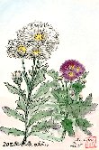 秋を代表する花を畑で見かけましたのでこのように描いてみました。白と濃い紫の菊がまとめて植えてありましたのでそのままスケッチしたものです。茎や葉の色も多少花の色に似て濃淡がはっきりしています。菊の開花期間は非常に長くつぼみも次から次と出てきますので、その生命力には圧倒されます。この花をスケッチしたついでに2本ばかり失敬して自宅の一輪挿しにさしてあります。 |