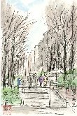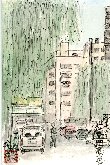 冬の太陽光線が寒さに抗ってはだかの並木や道行く人たちに当たっています。ここは東京中央区の甘酒横丁の南端、浜町公園正面付近です。この辺りも何点か描いていますが、緑から遠ざかった風景は別のイメージを表します。あと1・2ヶ月で再び新芽を吹き出すことでしょう。このページをご覧いただく頃には歩いている人たちもコートから開放されていることと思います。 |