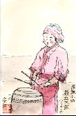 私の自宅から車で10分足らずのところに、昨年暮れ大きなスーパーマーケットが2ヶ所出来ました。一つのマーケットで正月の初売りを覗いたところ、このようにパーフォーマンスを見ることが出来ました。岐阜県飛騨小坂から来たという、男ばかり10人程の太鼓と獅子舞のグループです。この絵はおかめに扮して太鼓を叩いているものです。たった15分ほどの演奏でしたが、マーケットの狭い空間は太鼓の音と演奏者と客との掛け合いで結構楽しめました。獅子舞の絵にも挑戦しましたが動きが速く失敗でした。 |