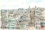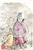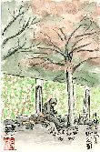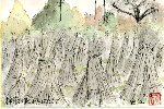 浜町公園は私の事務所に近いので、昨年はかなり多くの葉書絵を描きました。ここでの冬の絵は初めてですが、この寒さの中でも相変わらずホームレスと思われる人たちが思い思いの姿をみせています。落葉間近かの小枝の下で、弁当を食べながらご飯粒かおかずを鳩に与えているようです。前かがみの姿は、野鳥とともに木枯らしに耐えて生きる人間の哀れを象徴しているようです。苞 |